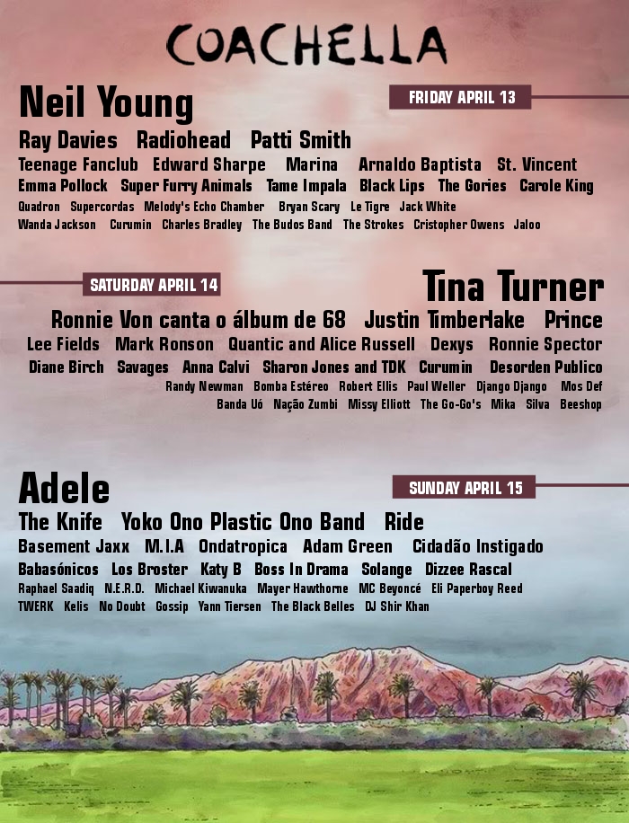 Não sei se esse link é do próprio Coachella mas nesse site Create Your Own Festival Line-Up dá pra criar o seu festival dos sonhos. Que tal o meu? ;-) PS: Pohan, agora que eu vi que a bagaça cortou justo o Franz Ferdinand, que eu amo! *rs O sinal de & dá erro, não o usem! ;-) Marina seria Marina and The Diamonds e Edward Sharpe and The Magnetic Zeros e Adam Green e Binki Shapiro